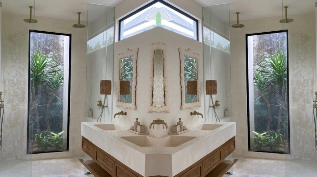 Paduan material alami seperti wastafel batu, kabinet kayu, dan aksen lampu etnik menyatu harmonis dengan cahaya luar, menghasilkan suasana ruang mandi yang mewah, segar, dan menenangkan.