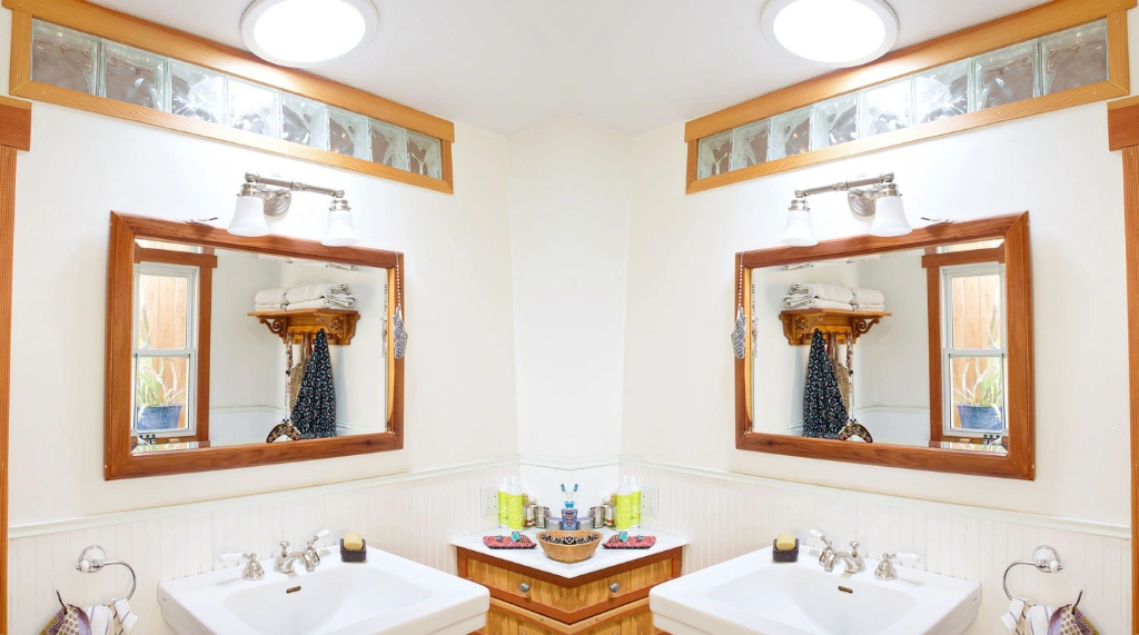 Perpaduan material kayu pada bingkai jendela dan cermin menciptakan keselarasan desain vintage yang apik di tengah dominasi dinding putih yang bersih.