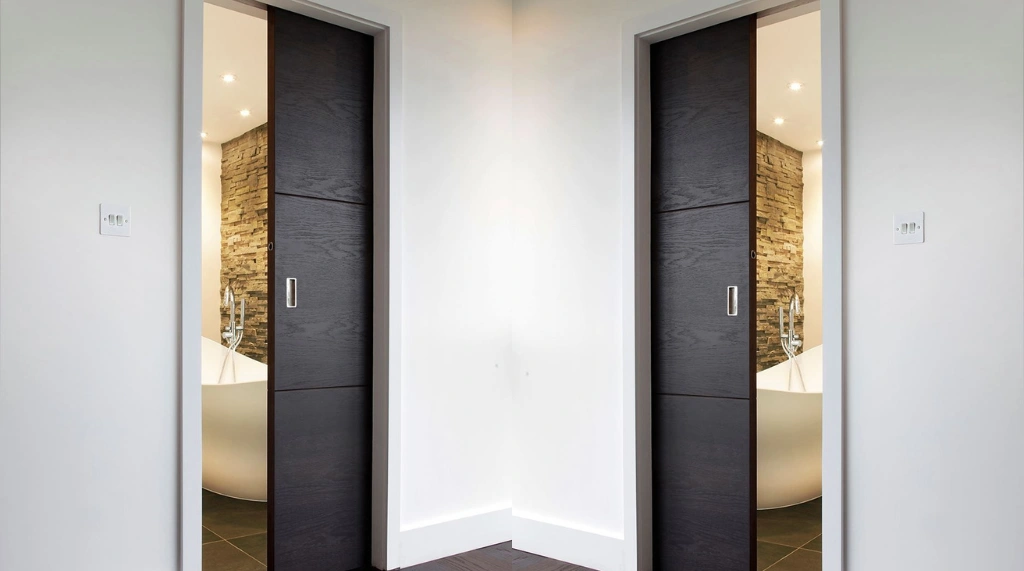 3. Pintu Kamar Mandi Sliding Kayu Ebony dengan Sistem Pocket Door